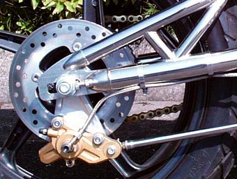 RR.キャリパーはホンダのX4用に交換。取り付けをフローティングタイプになるよう設計して造り変えた。