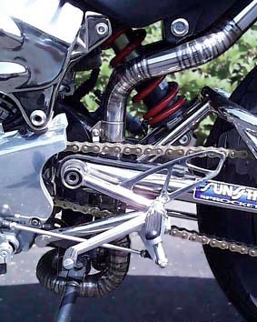 EXP.の造り方の難点は、RRフォークのピボット間に3本のエキパイを通す設計と、それによる曲げRの小さいEXP.を造ることだった。パイプは半径の2倍Rが機械曲げの最小Rだけど、これはそれを極端に下回るRなので、パイプを輪切りにして真円度を保つことと、管長を計算して輪切りの角度を決める、そしてコツコツと溶接して造り上げたものだ。