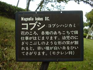 ご覧下さい、この立て札 ジャーン! そしてこの木の実の正体は 「コブシ」だったのです。 |