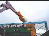 | 冷蔵庫を掴んで | 解体機に運んで | バリバリ分解 | ばらばらになった冷蔵庫 |