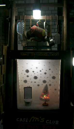 この店は結構昔から愛用してるんだけど、「カフェ」っつー感じよりあくまでも「喫茶店」なんだよなあ。で、マスター手作りの、季節ごとの看板の中の工作物?ここのマスター工作が好きなみたいで、結構笑えるっす。