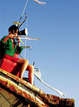 シネマ ファシスト 第58回 2006年12月号 『弓』 気ままな映画だと思う。勝手な映画だと思う。自由な映画だと思う。発想のおもむくまま、他の事象は気にせず、それほど必要のない予算で、映画をつくっている。 無声映画でもないのに台詞はほとんどない、物を言うのは視線と音楽と弓矢。ケイタイとウォークマンが出てくるのでようやく現代の話とわかるが、それ以外は時代すら不明である。他は想像力で見てゆくしかない。魚と水と隔絶された場所、これがキム・ギドクのキーワードか、『弓』も舞台は海上のつり船、そこで暮らす老人と少女と出入りする男たちの話である。 ラスト結婚式からのシーン、イメージが飛翔する。婚礼、初夜と続くかと思いきや、いきなり弓が天に向って飛翔し、老人は入水、弓が少女の股間近くに突き刺さって、もだえ、そして処女の血が衣裳を染め、少女は少年と陸を目指す。老人とともに暮らした船は、ブランコとともに船の壁画とともに沈む。見る者が自らのイメージで補って、映画のイメージがさらに実際の映像以上に膨らんでゆく。キム・ギドクだけの映画である。 | ||
