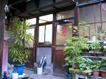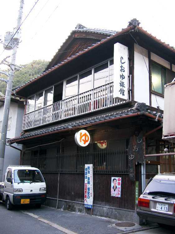 バス停を降りて2分ほど、古い住宅街の中に…「しおゆ旅館」の看板と、丸い「ゆ」の看板。広島はなぜかみんなこの丸い「ゆ」が出てるっすね。建物がまた、木造の風格はあるけど庶民的な建物。銭湯はこの奥の部分にある模様なんで、洗いものとかやってる脇を抜けて奥へ。手前の部屋に座っている親父が番台代わり、ここで350円払うっす。なんか人の家に来たみたいだな。