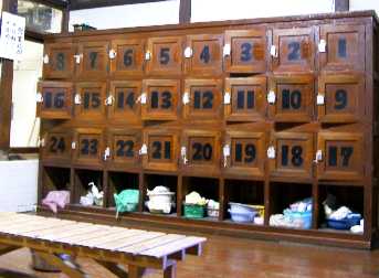 入り口は「男」「女」に分かれてて、そこはさすがに銭湯っす。中に入ると土間に下足棚。番台らしきものがあるんだけど、今は使われていない模様。男女の境にはカーテンの出入り口。木の番号が書かれたロッカー。ロッカーの鍵はツルカメっす。鍵付きロッカーは旅行中の身分としては有り難い。天井はまずまず高いかな?家庭用体重計、プラスチックの籠も積まれているっす。真ん中に木の長いす、さらに…水の張られた金タライ?灰皿代わりになっているっす。
