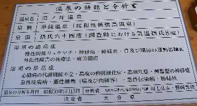 入り口に200円入れてください、と投入箱。要するに、誰も人がいなくて勝手にカネ入れて入るっつータイプ。ガイドブックには100円とあるから、値上げしたのか…なお、観光客は10時から18時まで。18時から22時までは地元民専用の入浴タイムのようっす。入り口を入ると管理組合の名札がずらりと並ぶっす。まさに共同湯。九州大学分析の泉質表があるが、単純泉とのこと。湧出温度は60度以上あるっす。