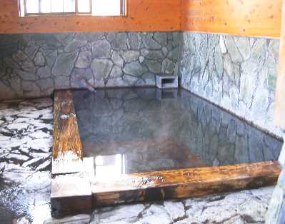 浴室へ。うん〜、これは結構いい感じだなあ。シンプルな浴室だが、天井高い木造建築。真ん中に岩風呂風の綺麗な浴槽が一つ、フチは木になってる っす。ひっきりなしにお湯が注ぎ込まれているようなので、とても綺麗な湯っす。まだ午前中なんで、なんかまぶしい。