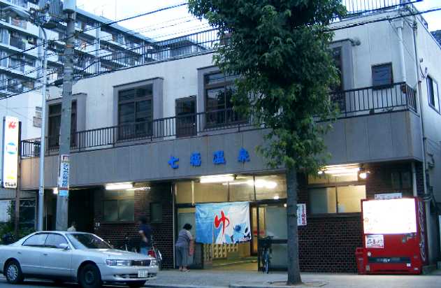 さて、通りに面して七福温泉発見。構えは一般的な大阪の銭湯だが、煙突の形がややユニーク、太めで低めの煙突、先がきゅっとすぼまっているっす。下足板の鍵は大日之出。正面には植田工務店による屋号が描かれた石の板。大阪で良く見かける光景っす。