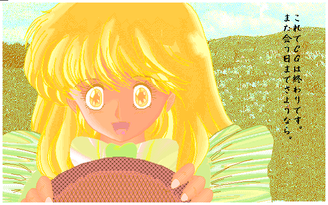 このあたりから加熱的ブームはなくなり(まるでバブル景気みたいね)私も売るためのCGから趣味のCGに変わってくる。よって、このあたりでこのシリーズの販売CGはラストになる。ラストの割には先の3つの条件を見事に満たしている、とてもとてもすばらし〜い作品です。 640x800・16色・GIF |