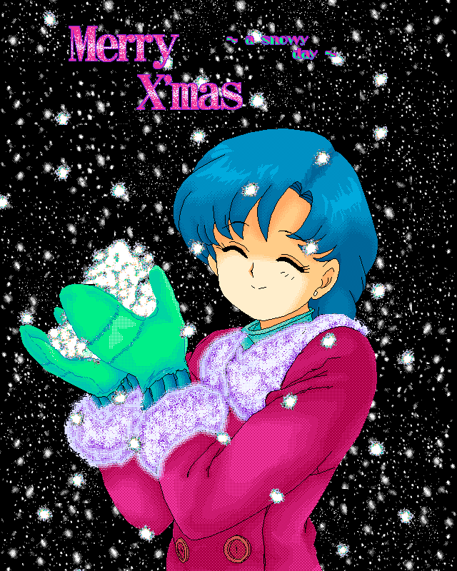 12月だったので、クリスマス向けのCGでした。中々よく出来た方で、サークル内でのその時点での販売及び人気がトップでBBSのDL率もよかったです。 まぁ販売&人気に関しては、世の中の事情のおかげですけどね(笑) 雪を表現するのに悩んだ記憶があります。 640x800・16色・GIF |