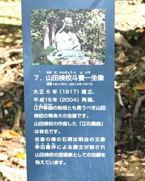 前置きが長くなってしまったが、江の島には二人の検校さんが深くかかわっている。一人は管鍼術という療法を創案した杉山検校と、江戸中後期に江戸でヒット作品を作曲したシンガーソングライターで山田流筝曲の祖でもある山田検校である。