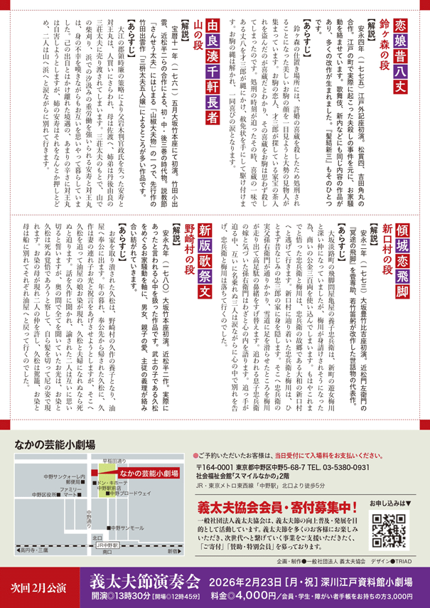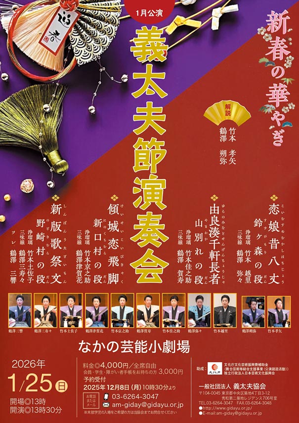 ◎障がい者割引3,000円(障がい者手帳をご提示ください) *お申込・お問い合せ=(一社)義太夫協会 TEL 03-6264-3047 email: am-giday@gidayu.or.jp http://www.gidayu.or.jp/ |