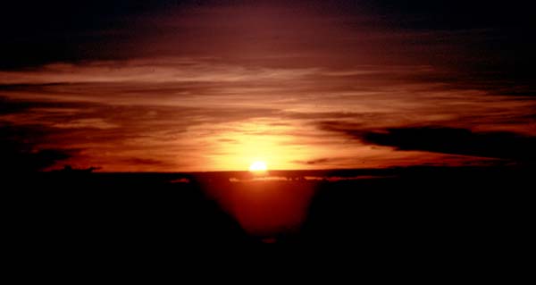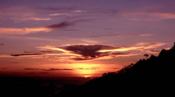 山頂近くで一息したとき、山の峰々が朝日を浴びて、一日の生活を始めるシーンは