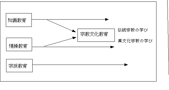 狭い意味の宗教教育である「宗派教育」は宗教系の学校のみで行えるので、従来「知識教育」「情操教育」として区分されてきたものが、宗教文化教育においてはどういう位置付けになるかを最後に述べたい。