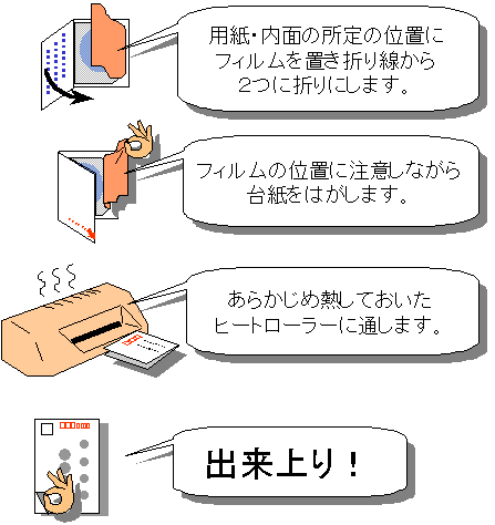 印刷された用紙に圧着用のフィルムをはさみ付属のヒートローラーで圧着します。