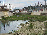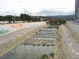 | こっちは護岸工事が終了した部分。カモもいませんし、草も生えません。写真の左側に見える赤い模様は、瀬戸物で壁画を作っているわけですが、人工的過ぎてあまり美しくは見えない。 |