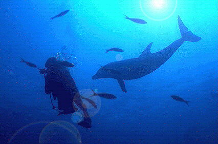 もちろん会えますよ!!最近何かと世間を沸かせている「イルカくん」。 あのキュートでどこか知的な彼の目を見つめると、誰もがきっとファンになってしまいます。 さて、かくいう私も実は「イルカくん」が大好きです。 というか、最近ファンになりました。 実はそれまで、なんとかシーワールドとかの愛敬振りまくりの「イルカくん」より、 ダイナミックな「オルカ」(シャチ)を私は愛していました。 ところが、忘れもしないモルディブでの野性「イルカくん」との出合い。 カタマランという小さな小さなヨット乗って、近くの島まで買い物にいったり、 スキンダイビングで遊んだ、そんな帰りの出来事でした。 日も傾き掛けて、自分たちの島(南の島のリゾートへ参照)が大きく見え始めたそんな時、突然キャプテン(船長のこと。といっても船長一人と乗客二人です)が叫んだのです。 「ドルフィン!!!!」。 「えっ! 何処に!! と思う間もなく目の前でイルカが ジャーンプ!!」 「イルカだー すごい すごーい!!」 「うぉー きりもみ回転してるぞー! おお宙返りだー!! バック転してるーー!!」 まさか、こんな間近で野性のイルカに会えるとは想像すらしていなかった二人は、もー大はしゃぎ!!私なんかは、イルカの「宙返り」は人間が教えたものだと思っていたので、もうびっくり!!野性のイルカのダイナミックでスピーディーなジャンプを目のあたりにして、もう感動、感動、感動の嵐です。 そして、それはほんの2・3分の幻の様な一瞬の出来事でしたが、乗客二人は呆然と海を見つめ、一人キャプテンが「二人はラッキーだ! こういうことは本当にめずらしいんだ!!」と英語でまくしたてているだけでした。 そんなこんなで、もー大ファンです。