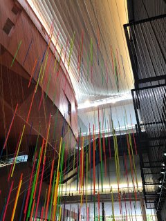この展覧会はパフォーマンスを絡めることが多く、7日もアトリアムで関連企画のパフォーマンスをしていましたが、 フロアにも敷物があるものの、メインが高い空間へのインスタレーションだけに、 エアリアルでもない限りパフォーマンスと絡めるのは厳しいな、と。 立ち見というのもかなり厳しかったので、通りがかりに少し観る程度に留めておきました。