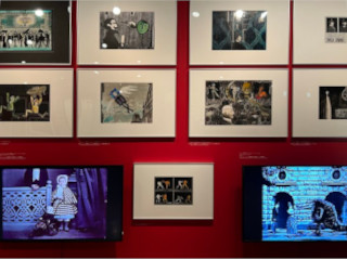 アニメーション作品に関する展示は原画などの関連資料展示だけでなく、 2Fライブラリを使って、15分弱の短編作品を2本、フィルムでではなくデジタル化したものをプロジェクタで上映していました。 Walerian Borowczyk と共同監督した Dom [en. House] 『家』 (1958) は 実写とストップモーションアニメーションを組み合わせたシュールレアリスティックな作風。 もう一本、Labirynt [en. Labyrinth] (1963) は、 19世紀風の細密で白黒の、時に一部彩色された挿絵版画を切紙アニメーションにしたもので、 そのコラージュ的なセンスとシュールな展開は、 アニメーション化された Max Ernst: La femme 100 têtes 『百頭女』 (1963) を観るようでもありました。