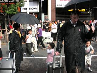 黒のレインコートにキャリーケースに黒い傘、という男女2人組が、