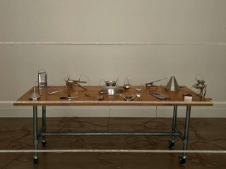 木製の食卓の上にスチール製のキッチン用品を並べて通電し、電球をちらつかせたりジジジジいう音を立たせたりした Mona Khatum の Home (1999) や、
