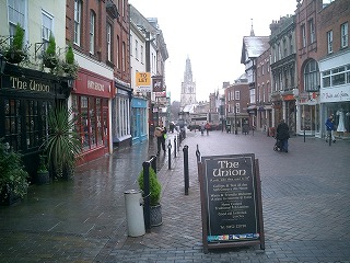 グロスターの町 こちらの建物は中世、チューダー様式の「ハーフティンバー」と呼ばれる木骨組の家で、各階が独立して、積み上げられていて、上にいくほどせり出しています。ドイツやフランスなどでもこの木骨組の様式が見られます。 グロスターには、他のコッツウォルズ地方でよく見らられる、蜂蜜色の石で作られた建物もありました。 |