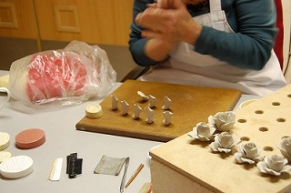 ウェッジウッドの工房にて バラの作り方はシュガー・クラフトととてもよく似ていて、一枚一枚作った花びらを重ねて1つの花にしていました。これだったらシュガー・デコレーションのバラと同じ様に私にもできるかな? |