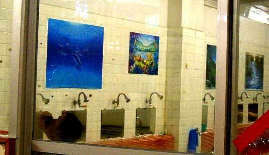 で、B級の極めつけ!お、壁にところどころにタイル絵がある、イルカや自然、結構綺麗な絵だな…綺麗すぎる…と良く見たら!なんとこれはタイル絵じゃなくって、タイルに紙のポスターを張りつけてある!こりゃ驚いた…!