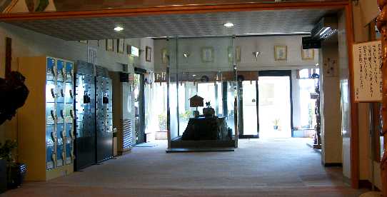 このフロントの前に貴重品ボックスがあって、財布とかの貴重品はここに入れとくっす。他に有料だが少し大きめのロッカーもあり。その向こうに露天の入り口があるのだが、手前に何やら派手な…イカにも温泉地っつーインチキ臭い観音コーナー?いや、やっぱり温泉地は、こういうインチキ臭いものがあっての面白さっす。