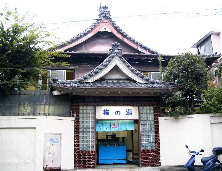 さて梅の湯、発射台型の煙突が目印。この付近にはあまり高い建物はないっす。正面に回るとこれまた立派な千鳥破風、まあ東京風の典型銭湯っすねえ。外から見ただけでは、廃業を感じさせるものは何も感じとれないが…下足板の鍵はおしどり、中に入ると番台形式。おや、この業界では比較的若いお姉様が座ってる…若奥様?