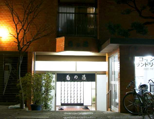 ちょっと入ったところに菊の湯発見、マップではこの周辺、ここだけが番台となってたし、営業時間も一番早かったので木造レトロかと思ったら新しいビル銭湯だったよ…隣にコインランドリー。屋号入りのシンプルな暖簾。下足板の鍵は松竹。