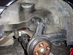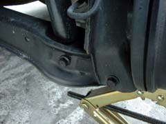 | アッパー側を緩めて、サスが下に落ちないように手で支えながら取り外します。一人だと、ちょっと苦しい。(w |