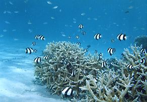また、コーヒーショップ側のやや外洋寄りの浅瀬には、エダサンゴと同じような大きさの、茶色くてボリュームのある「ほうき草(?)」のようなソフトコーラルがたくさん生えていて、ユラユラ揺れています。 |